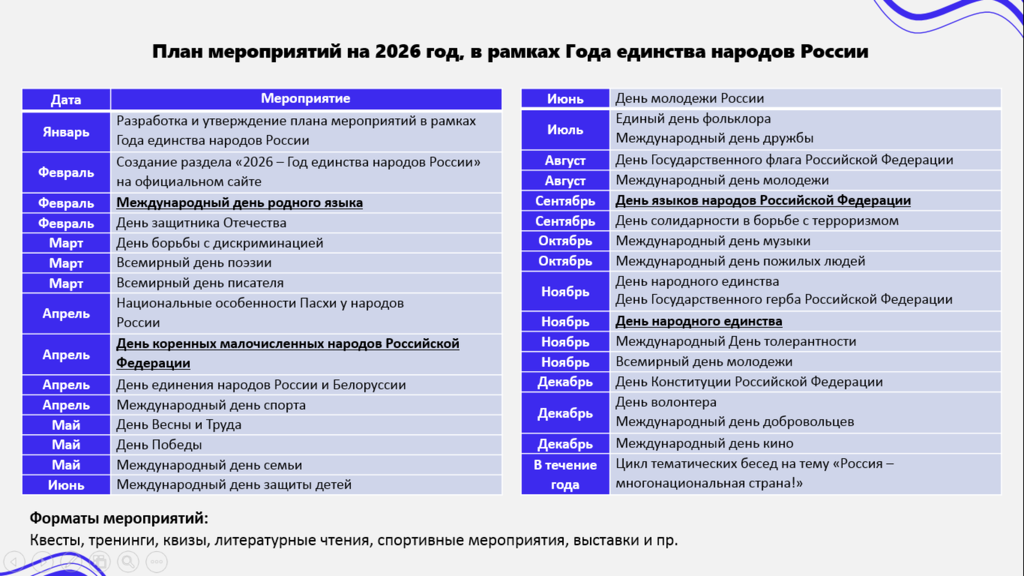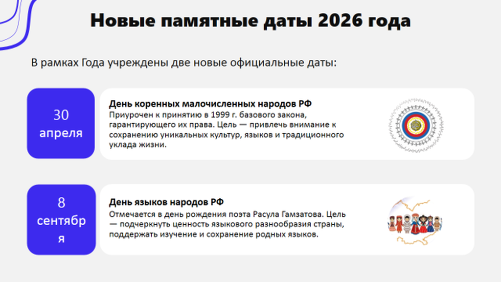 2026 год объявлен в России Годом единства народов (Указ Президента РФ от 25 декабря 2025 года № 962).