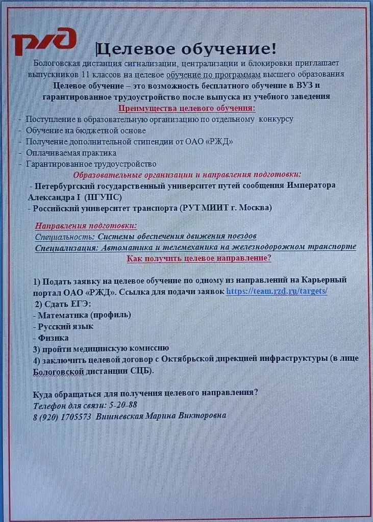 Уважаемые посетители сайта, педагоги, учащиеся выпускных классов и их родители (законные представители), информируем Вас о том, что Бологовская дистанция сигнализации, централизации и блокировки приглашает выпускников 11 классов на целевое обучение по программе высшего образования.