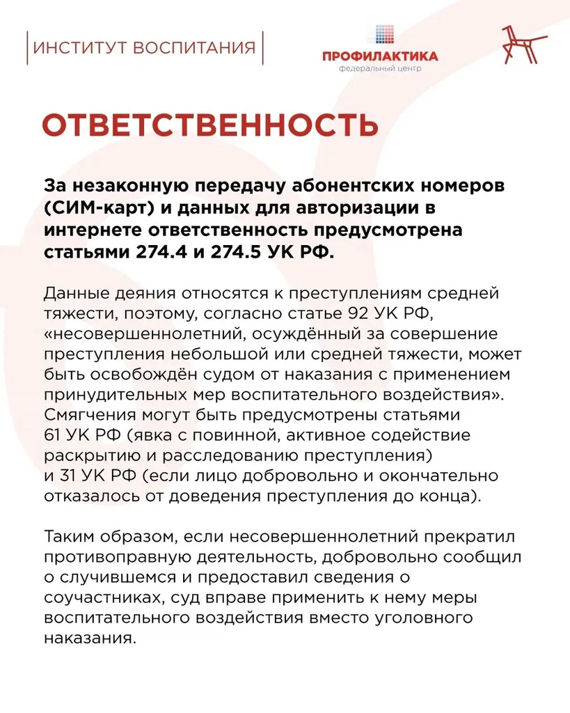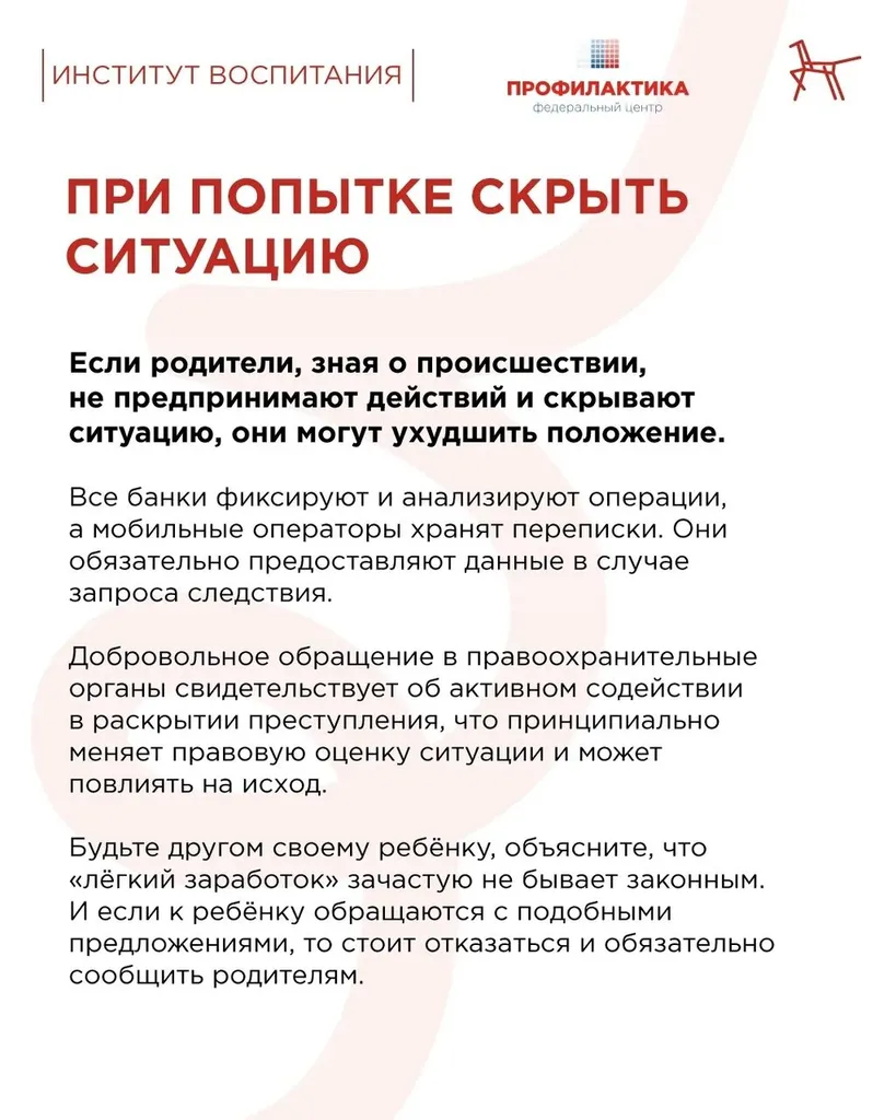 Часто злоумышленники убеждают детей, что участие в их схемах абсолютно безопасно. Но это не так! Даже если ребенок не понимает всей сути происходящего, он может стать соучастником преступления. Незнание законов, как известно, не освобождает от ответственности. А она, поверьте, есть, и может быть очень серьезной.